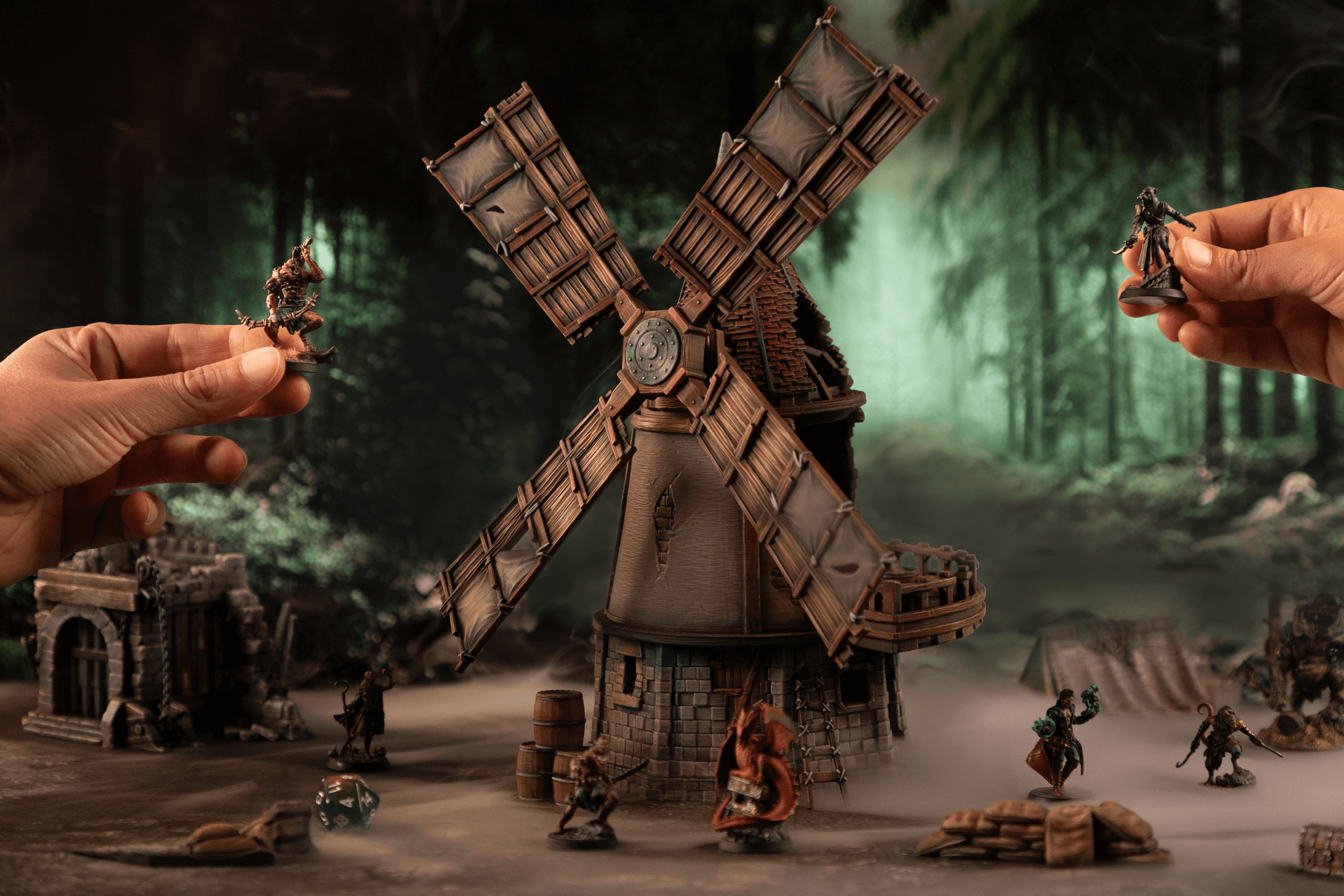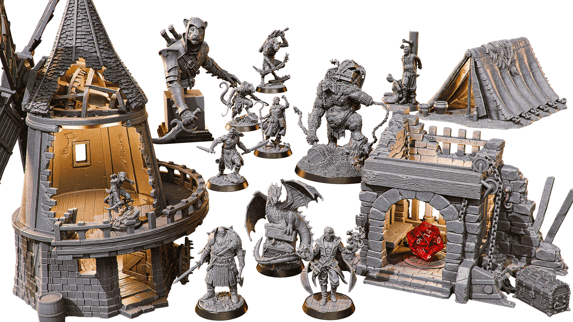 All the minis are available in resin (except the Old Mill), and two minis are available in FDM (Old Mill % Dice Jail).