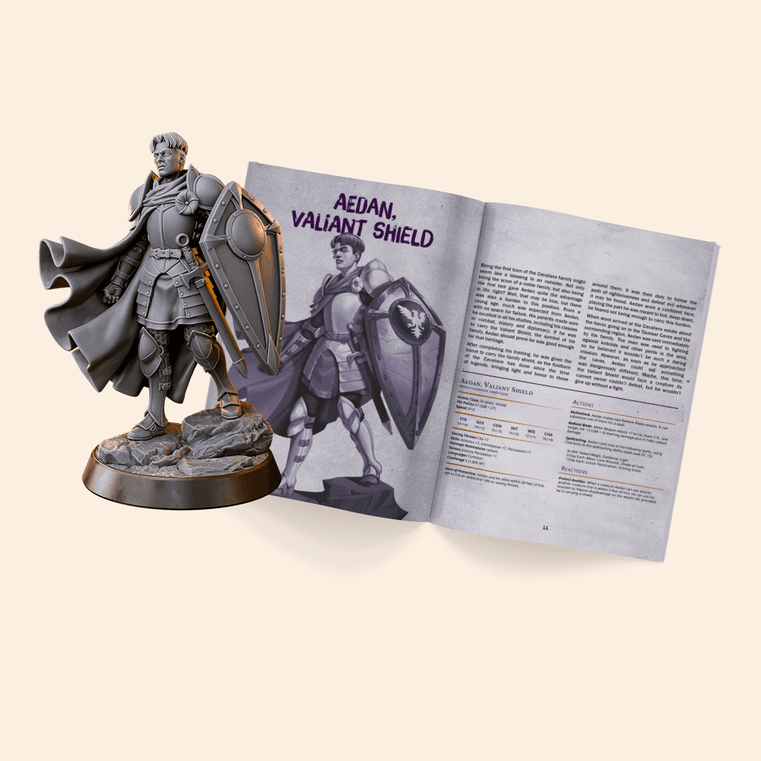 3D print Aedan, Valiant Shield for FREE and see for yourself the quality of our miniatures before committing to our subscription services! All our files are prototyped, pre-supported, and ready-to-print, so you can begin your next adventure as soon as possible. Test our supports for larger and smaller parts, our assembling cuts, and be amazed by the quality of every print!